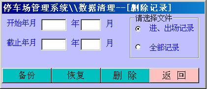 所有的停車數(shù)據(jù)都記錄在“進(jìn)、出場記錄”中,“全部記錄”只在緊急情況下用作修復(fù)“進(jìn)、出場記錄”。要刪除“進(jìn)、出場記錄”只要選擇好機(jī)號和時間段后單擊刪除,系統(tǒng)將提示是否保存到軟盤上,若不保存請單擊“否”,磁盤中該機(jī)號、該時間段內(nèi)的收費(fèi)數(shù)據(jù)將被刪除并且不做任何備份;若要保存到軟盤,請單擊“是”,系統(tǒng)將在軟盤上新建一個文件,文件名為“收費(fèi)機(jī)×.Mdb”,并且先將數(shù)據(jù)拷貝到軟盤文件中再刪除收費(fèi)機(jī)文件中數(shù)據(jù)。要刪除“全部記錄”,只要選擇好機(jī)號,單擊刪除按鈕,“全部記錄”中的數(shù)據(jù)將被刪除。